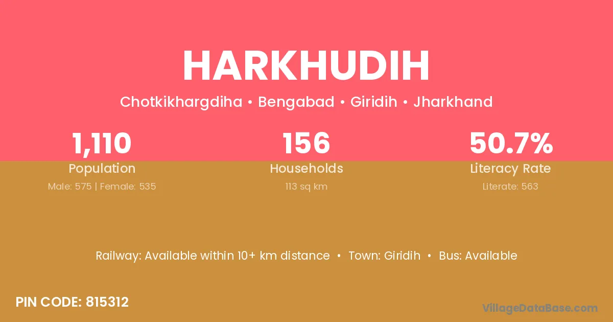 Harkhudih village has a total population of 1,110 people, of which 575 are males and 535 are females.
