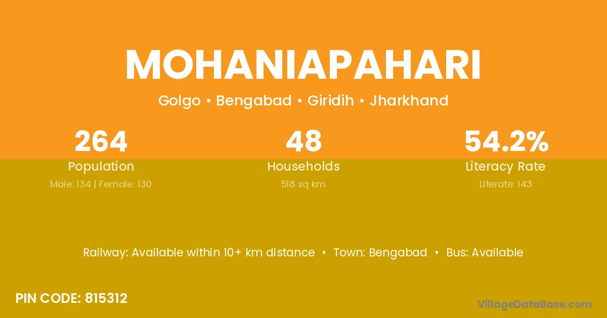 Mohaniapahari village has a total population of 264 people, of which 134 are males and 130 are females.