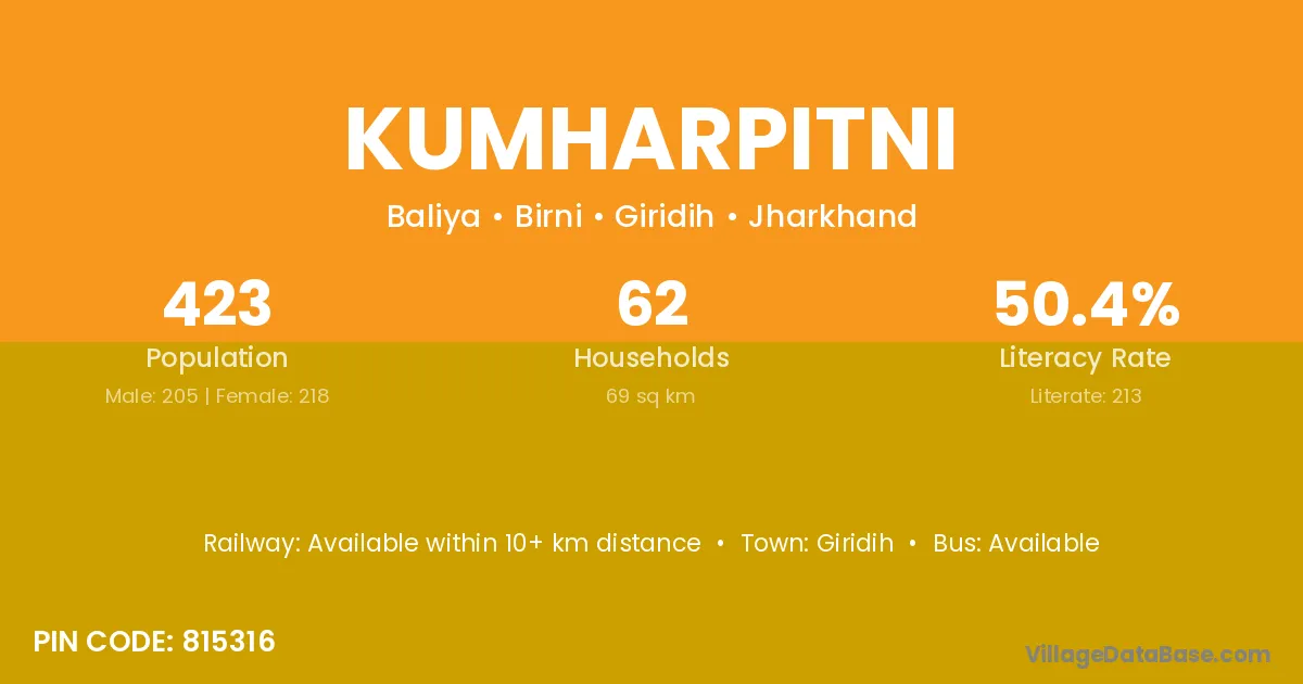 Kumharpitni village has a total population of 423 people, of which 205 are males and 218 are females.
