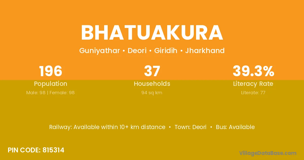 Bhatuakura village has a total population of 196 people, of which 98 are males and 98 are females.
