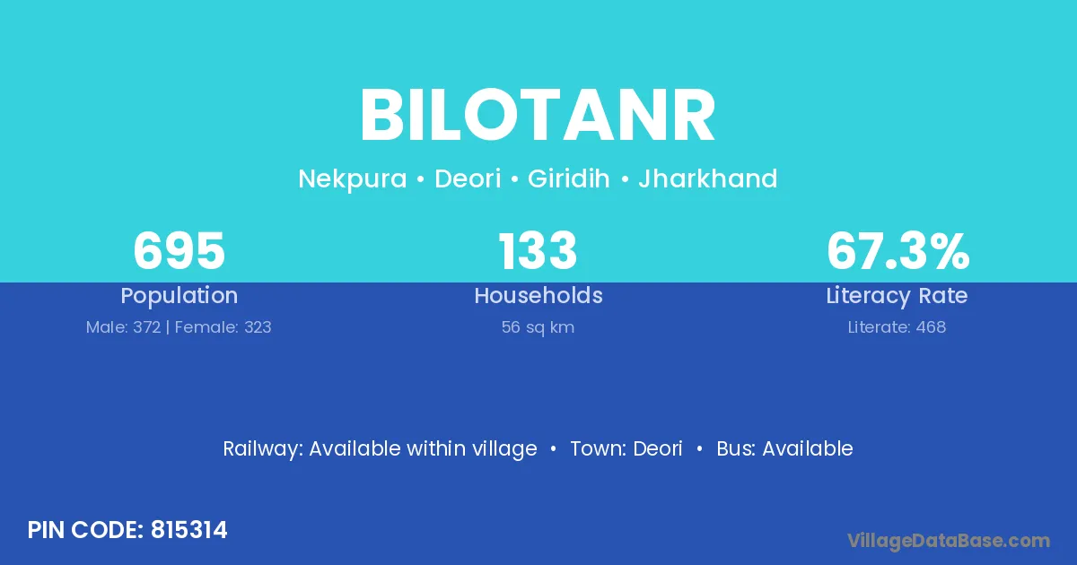 Bilotanr village has a total population of 695 people, of which 372 are males and 323 are females.