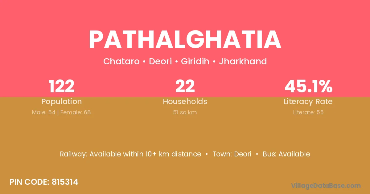 Pathalghatia village has a total population of 122 people, of which 54 are males and 68 are females.