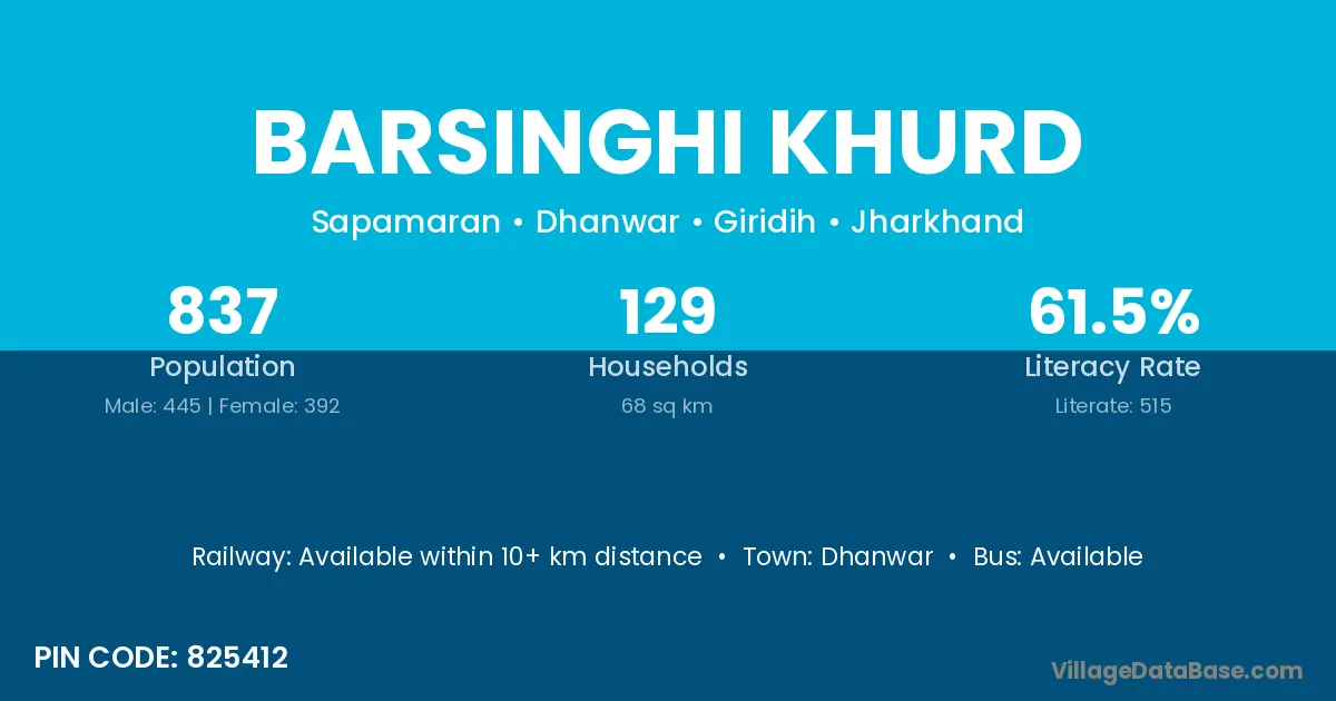 Barsinghi Khurd village has a total population of 837 people, of which 445 are males and 392 are females.