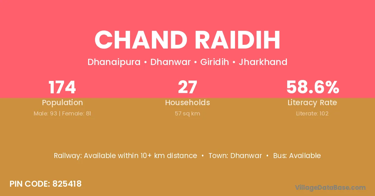 Chand Raidih village has a total population of 174 people, of which 93 are males and 81 are females.