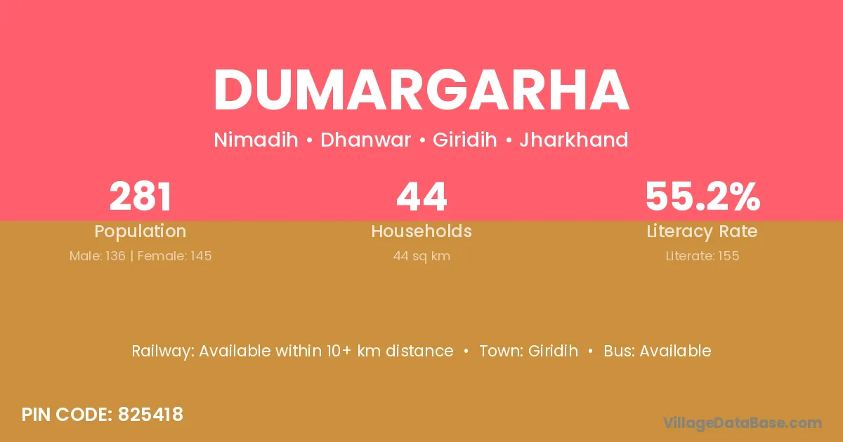 Dumargarha village has a total population of 281 people, of which 136 are males and 145 are females.