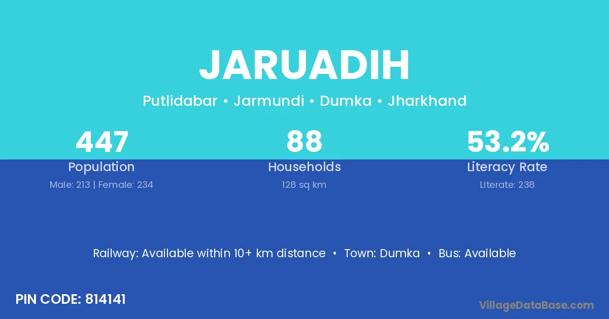 Jaruadih village has a total population of 943 people, of which 494 are males and 449 are females.