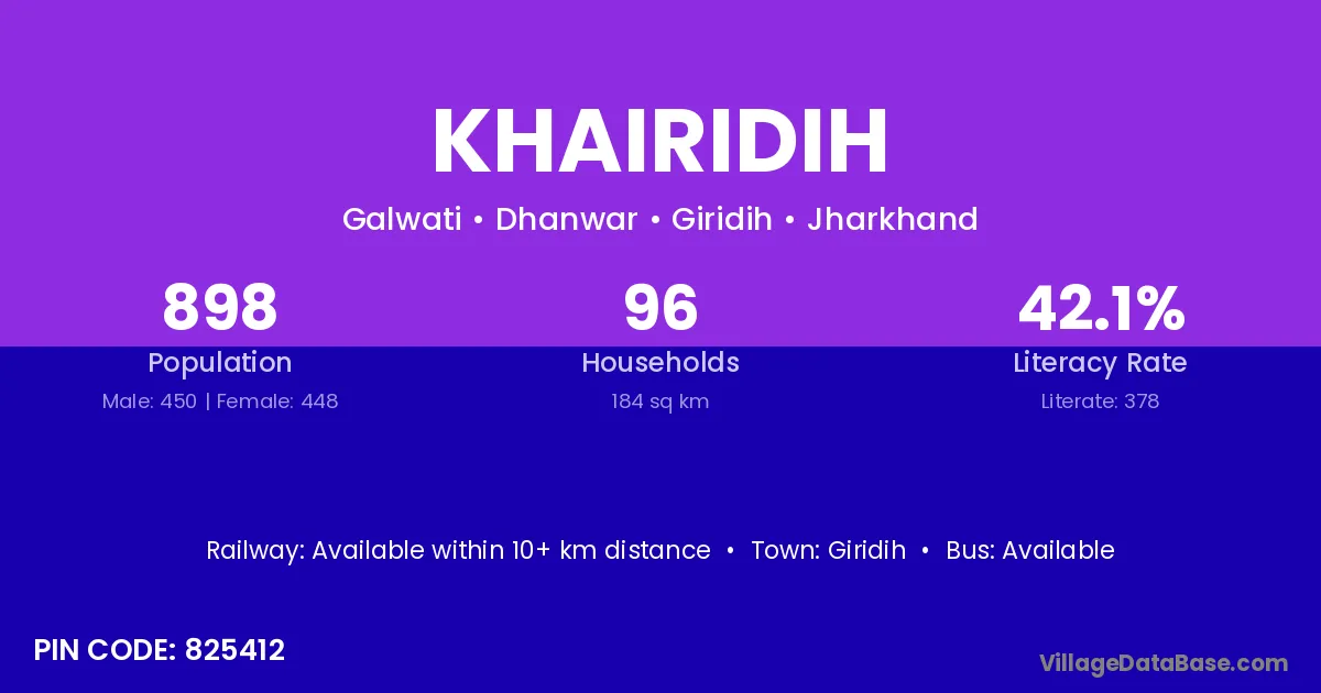 Khairidih village has a total population of 898 people, of which 450 are males and 448 are females.