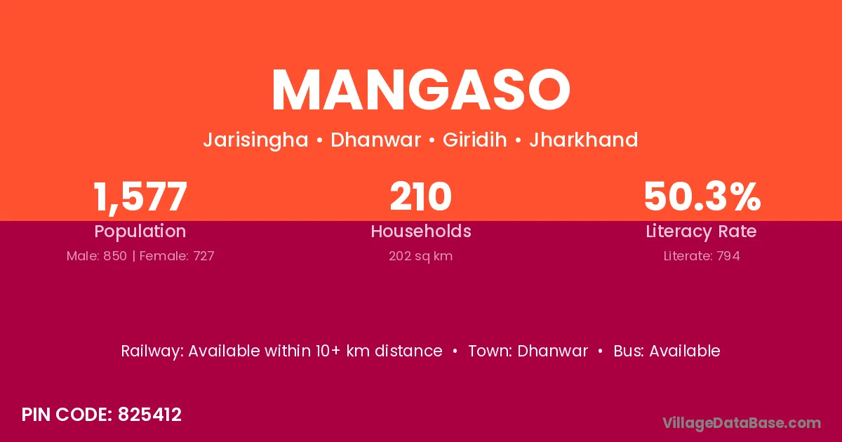Mangaso village has a total population of 1,577 people, of which 850 are males and 727 are females.