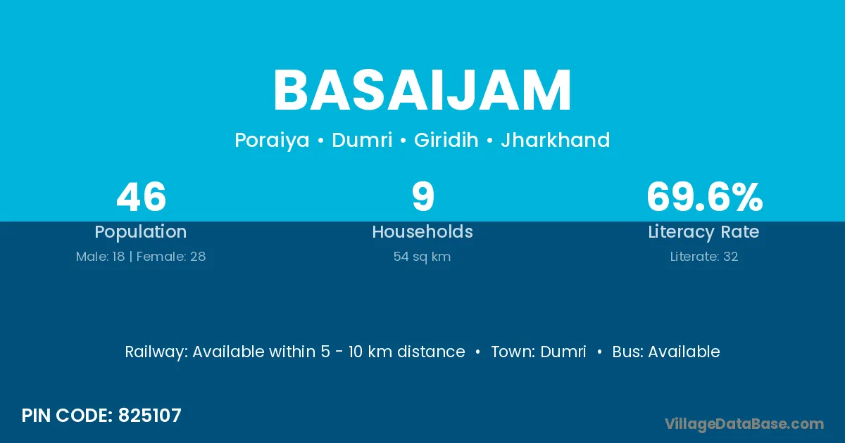 Basaijam village has a total population of 46 people, of which 18 are males and 28 are females.