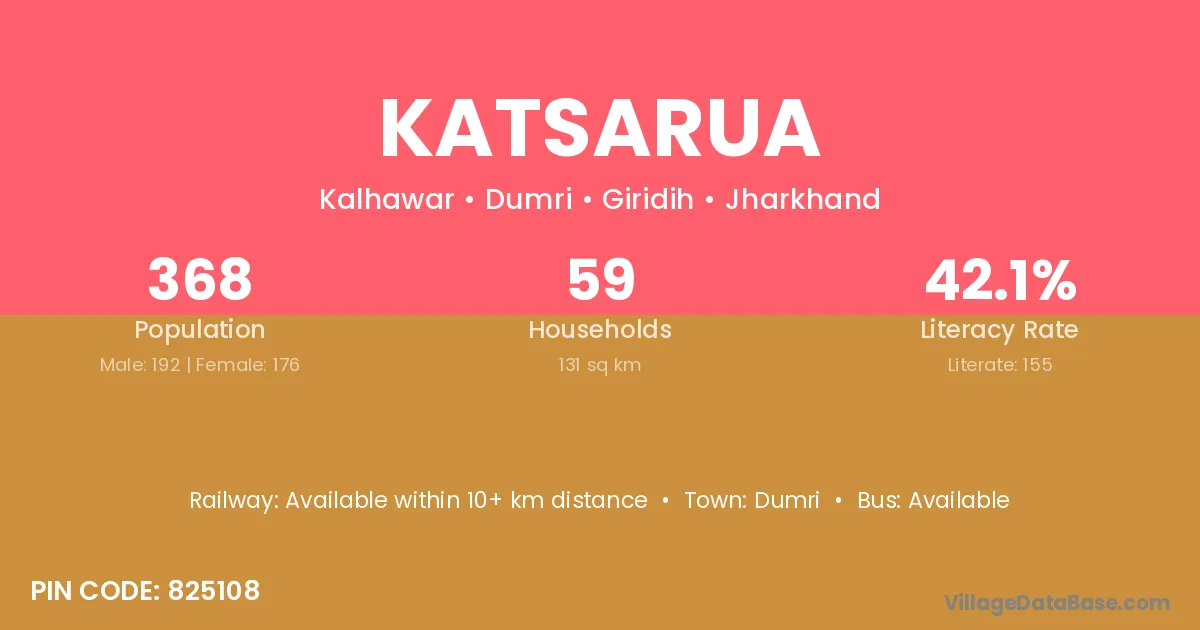 The literacy rate of Katsarua village is 42.12%. Male literacy stands at 47.92% and female literacy at 35.80%.