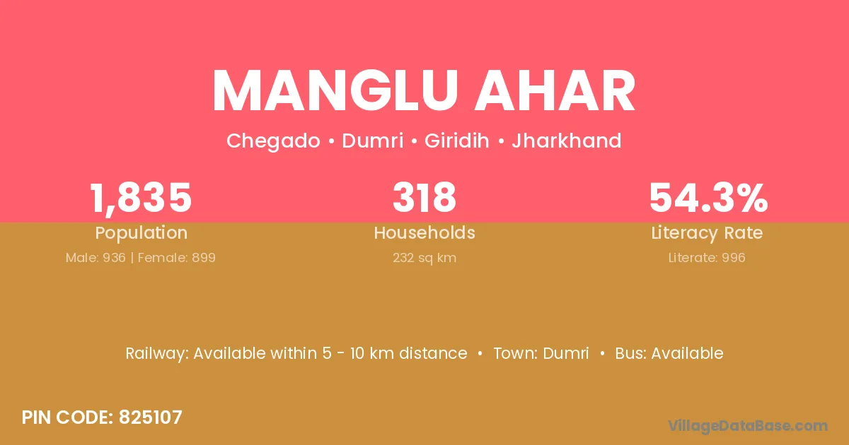 Manglu Ahar village has a total population of 1,835 people, of which 936 are males and 899 are females.