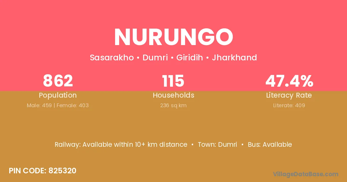 Nurungo village has a total population of 862 people, of which 459 are males and 403 are females.