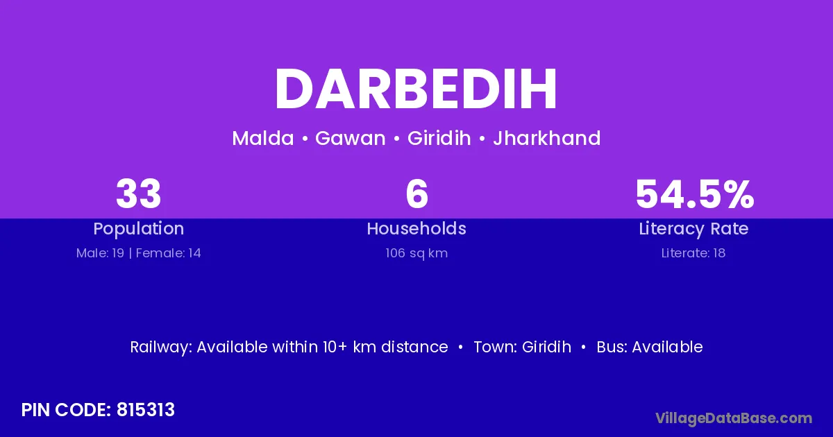Darbedih village has a total population of 33 people, of which 19 are males and 14 are females.