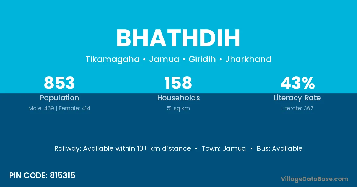 Bhathdih village has a total population of 853 people, of which 439 are males and 414 are females.