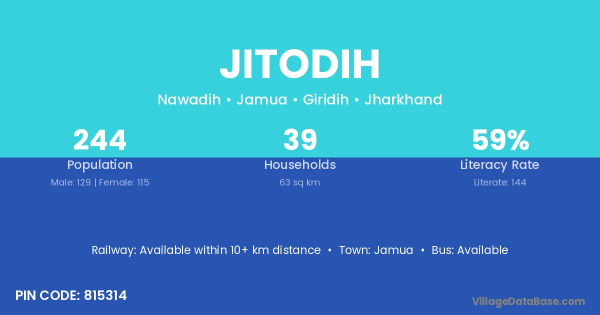Jitodih village has a total population of 244 people, of which 129 are males and 115 are females.