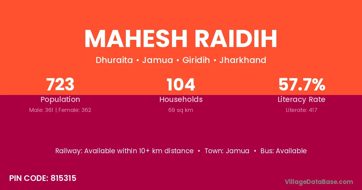Jamua is the nearest town to Mahesh Raidih village for major economic activities
