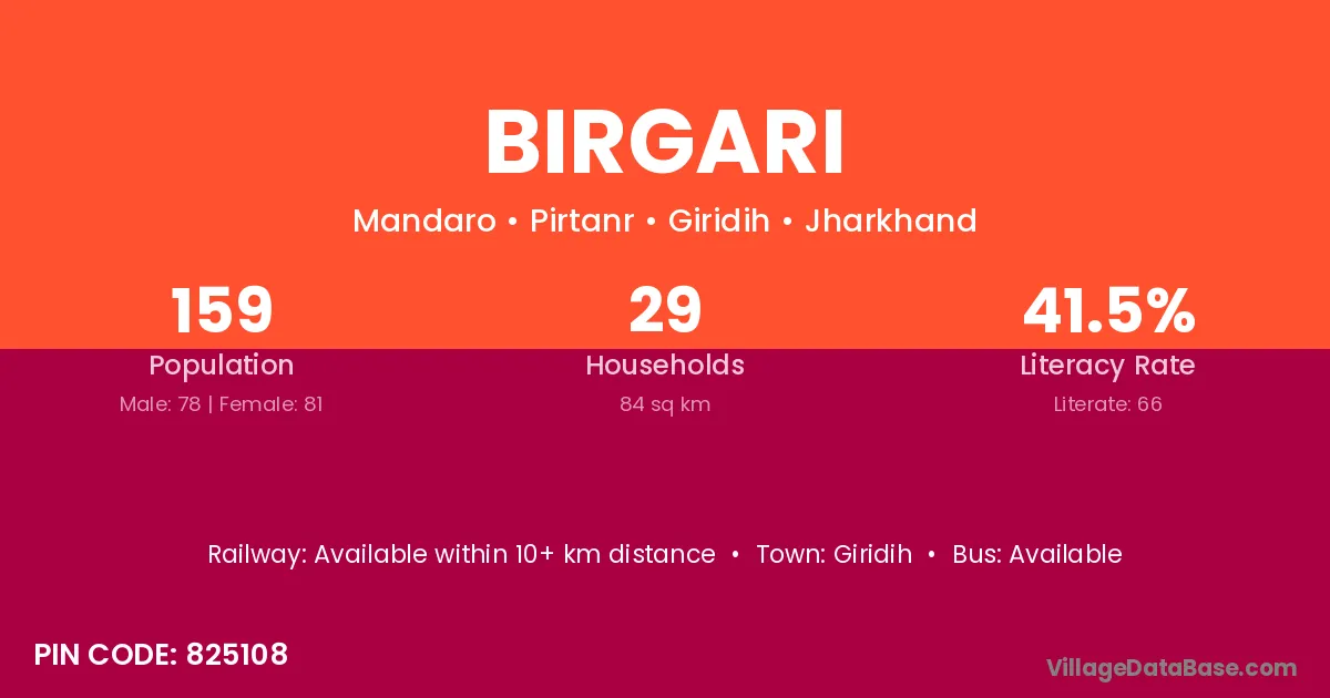 Birgari village has a total population of 159 people, of which 78 are males and 81 are females.
