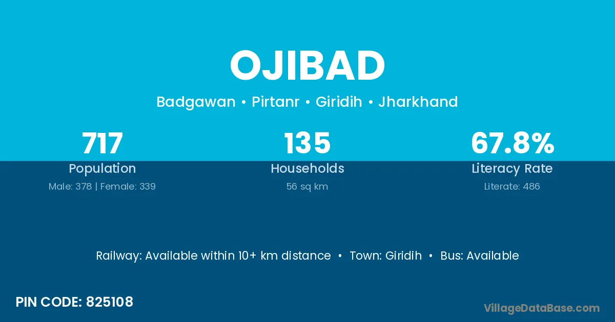 The literacy rate of Ojibad village is 67.78%. Male literacy stands at 79.63% and female literacy at 54.57%.