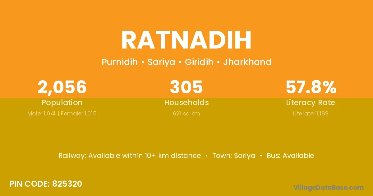 Ratnadih village has a total population of 2,056 people, of which 1,041 are males and 1,015 are females.