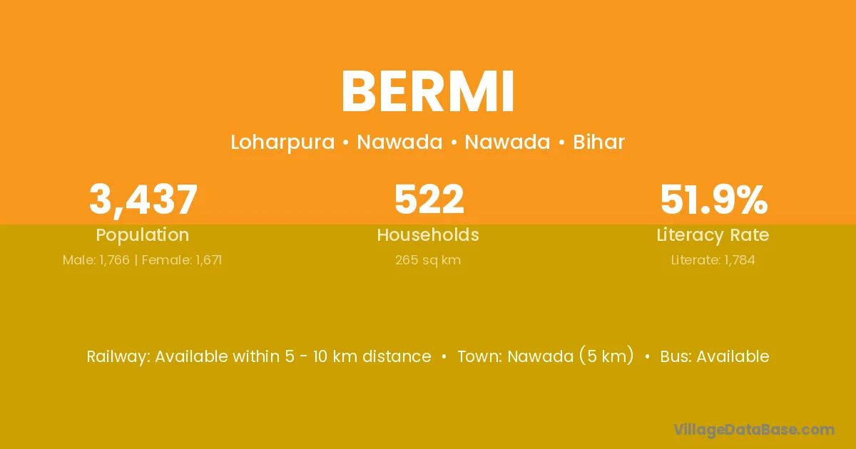 Bermi village has a total population of 55 people, of which 28 are males and 27 are females.
