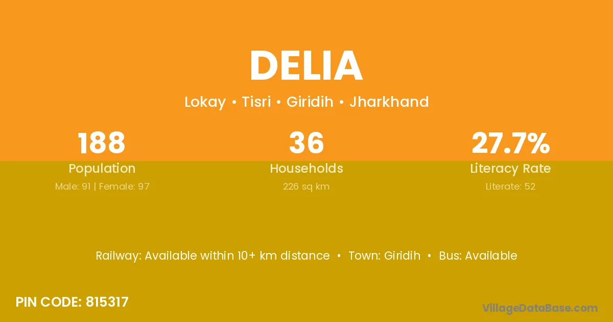 The literacy rate of Delia village is 27.66%. Male literacy stands at 39.56% and female literacy at 16.49%.
