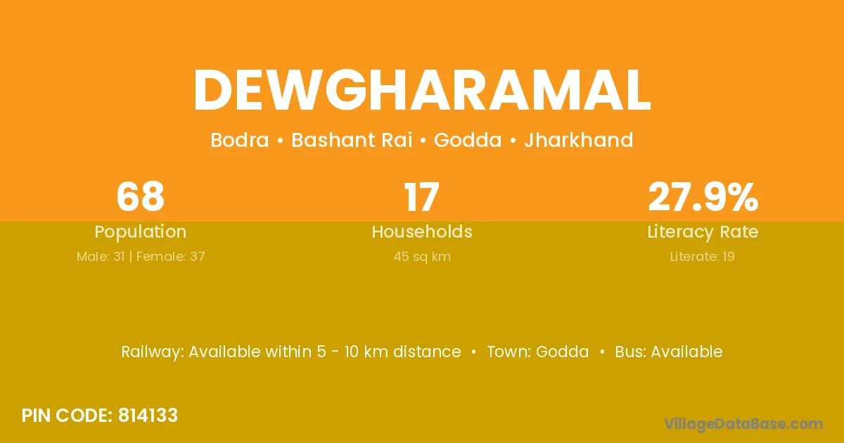 Dewgharamal village has a total population of 68 people, of which 31 are males and 37 are females.
