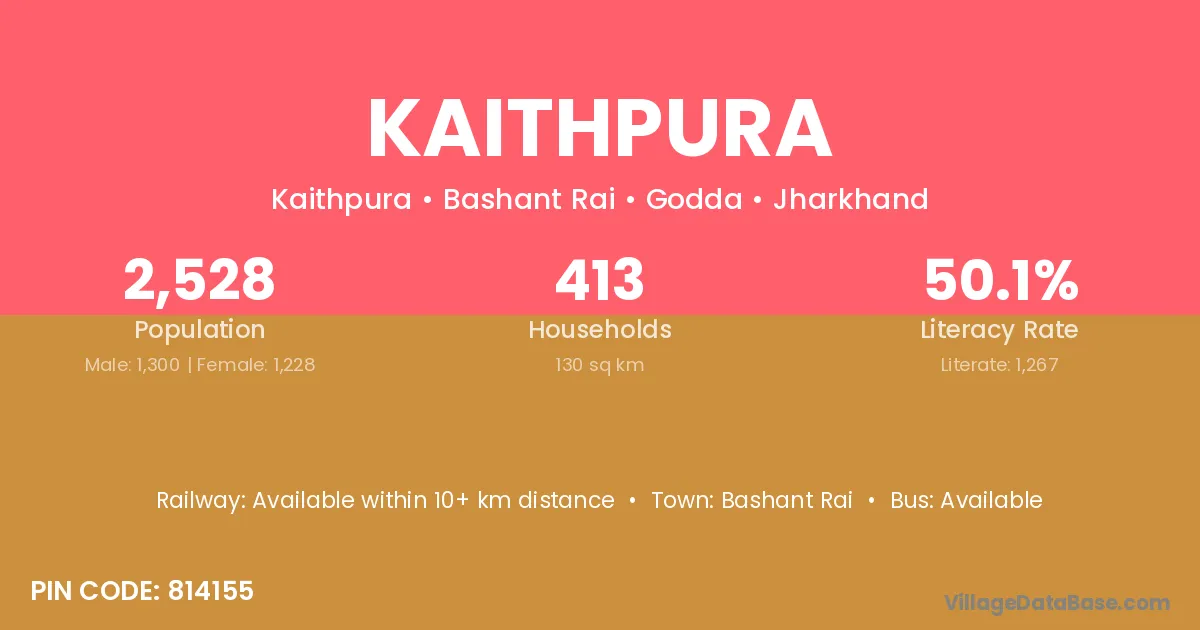 Kaithpura village has a total population of 2,528 people, of which 1,300 are males and 1,228 are females.