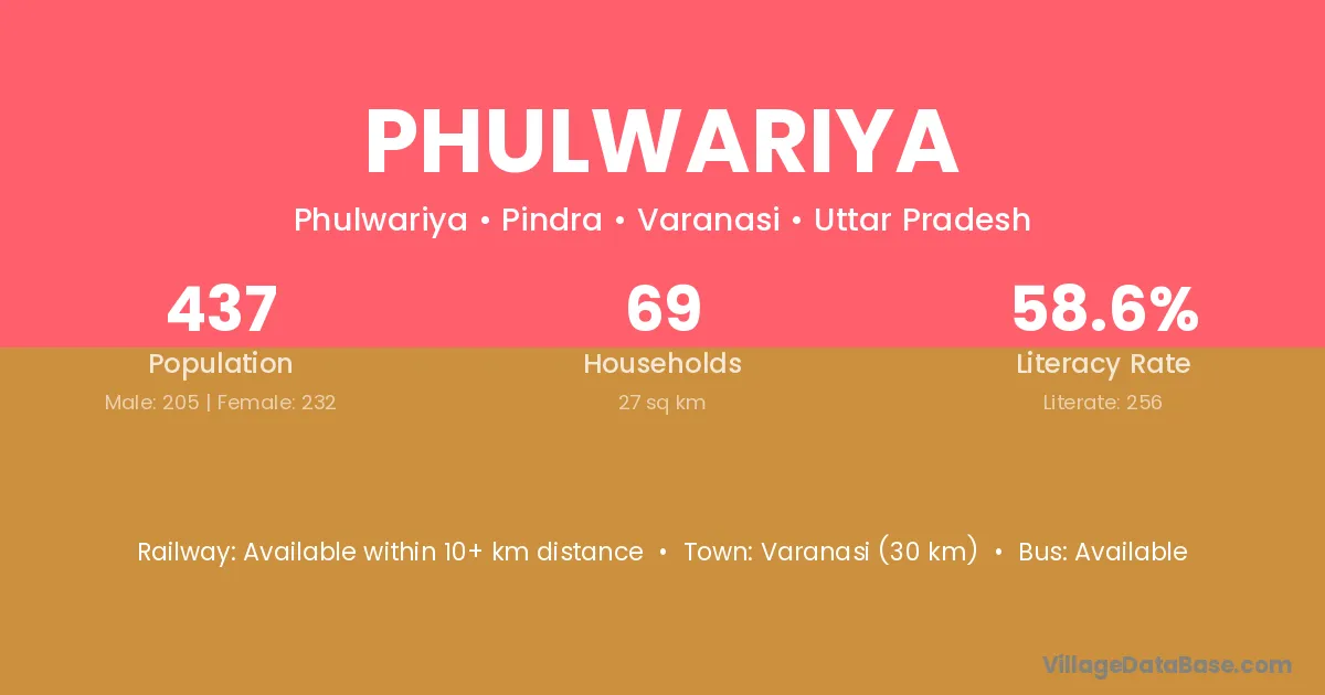 The literacy rate of Phulwariya village is 37.44%. Male literacy stands at 46.81% and female literacy at 28.71%.