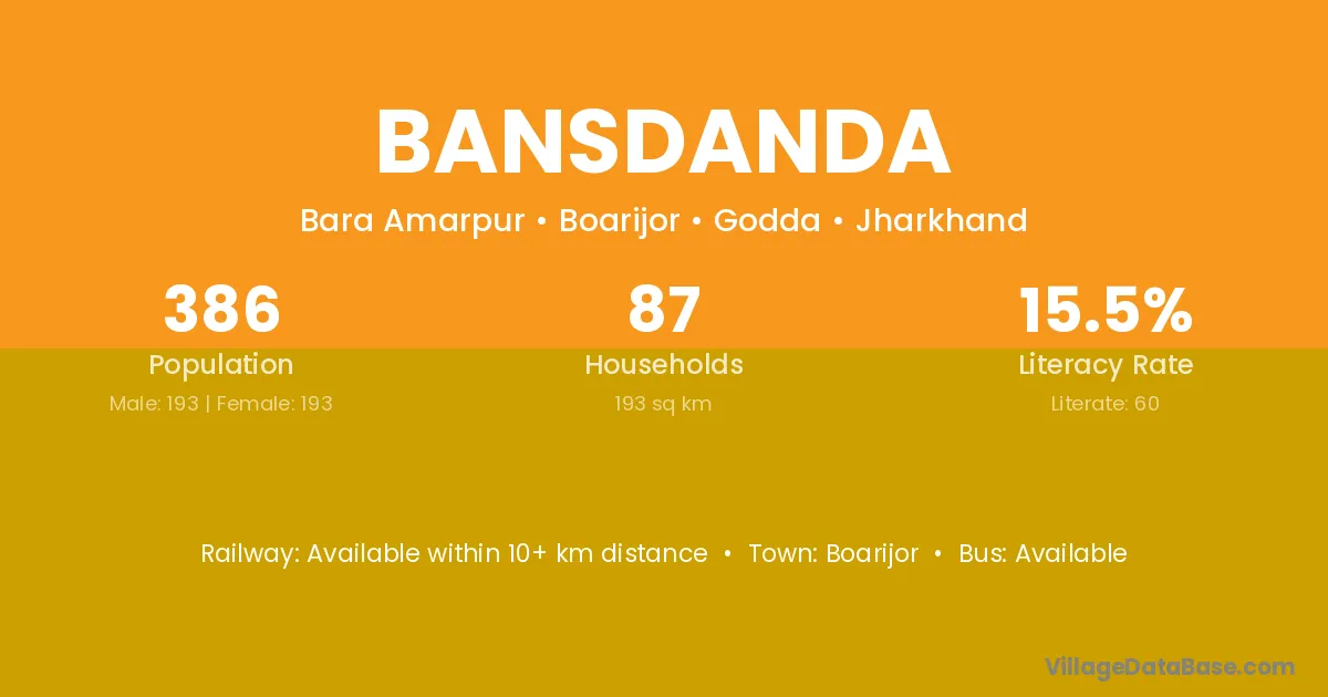 Bansdanda village has a total population of 386 people, of which 193 are males and 193 are females.