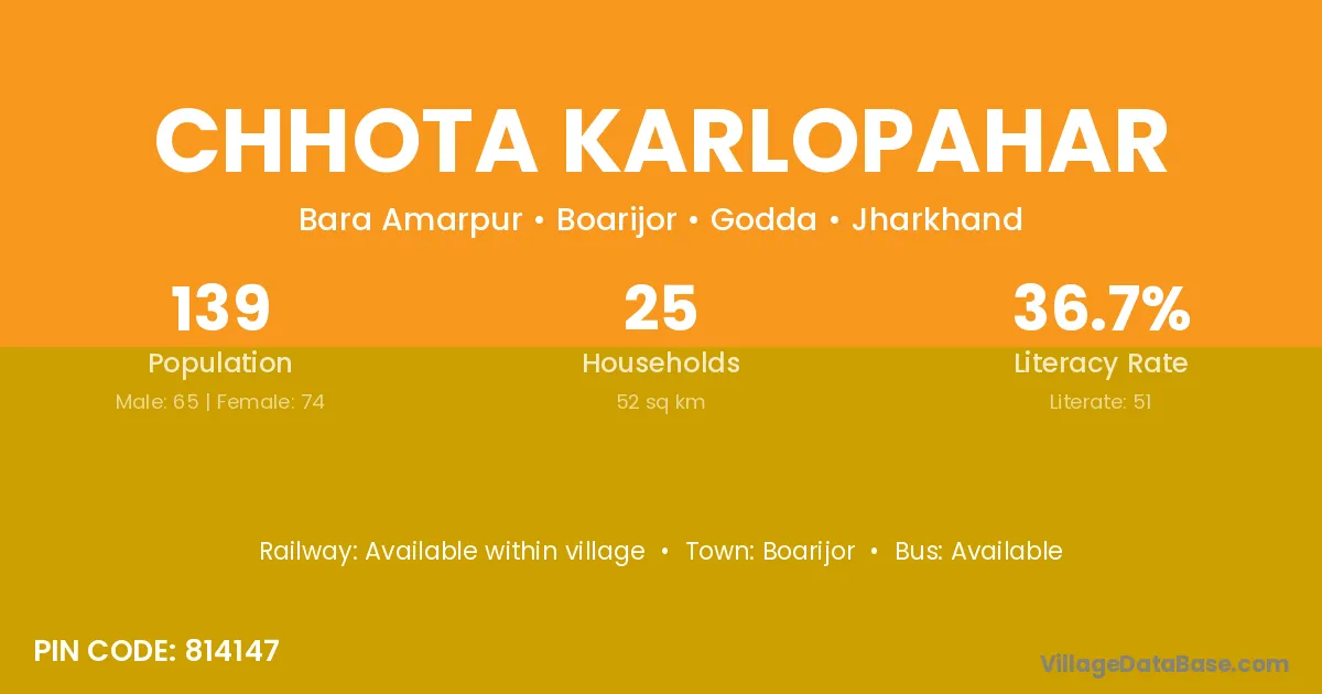 The literacy rate of Chhota Karlopahar village is 36.69%. Male literacy stands at 38.46% and female literacy at 35.14%.