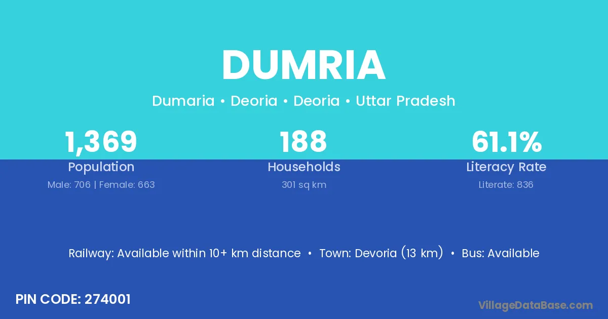 Dumria village has a total population of 1,078 people, of which 534 are males and 544 are females.