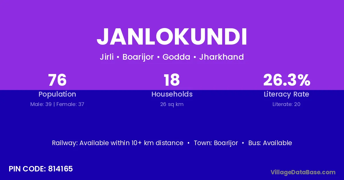 The literacy rate of Janlokundi village is 26.32%. Male literacy stands at 28.21% and female literacy at 24.32%.