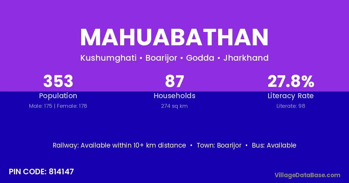 Mahuabathan village has a total population of 353 people, of which 175 are males and 178 are females.