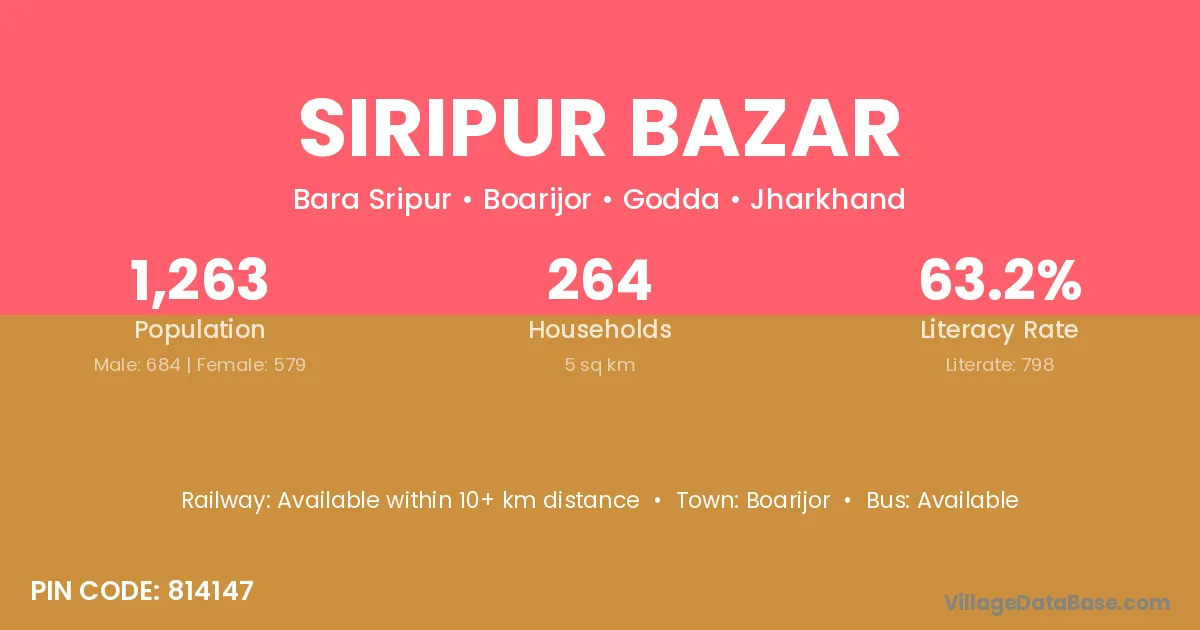 Siripur Bazar village has a total population of 1,263 people, of which 684 are males and 579 are females.