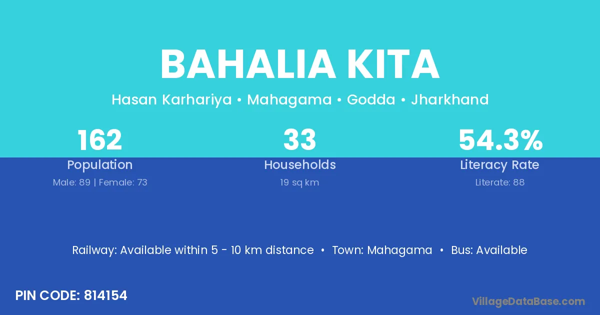 Bahalia Kita village has a total population of 162 people, of which 89 are males and 73 are females.