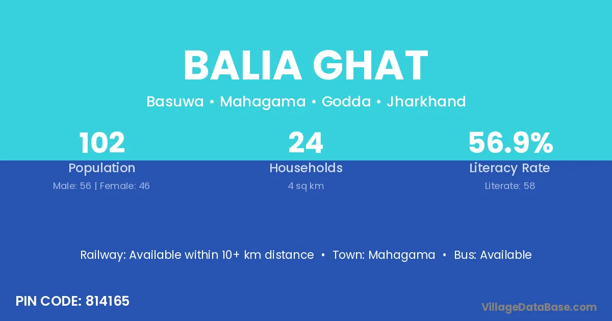 Balia Ghat village has a total population of 102 people, of which 56 are males and 46 are females.