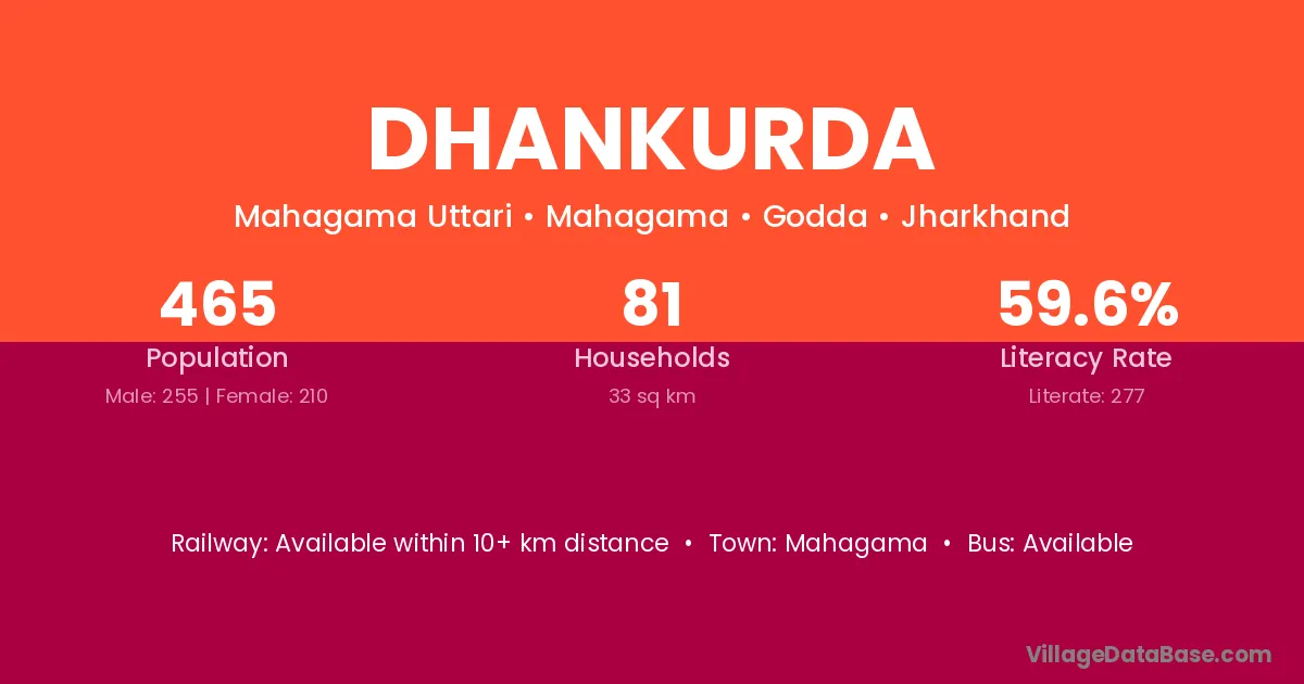 Dhankurda village has a total population of 465 people, of which 255 are males and 210 are females.