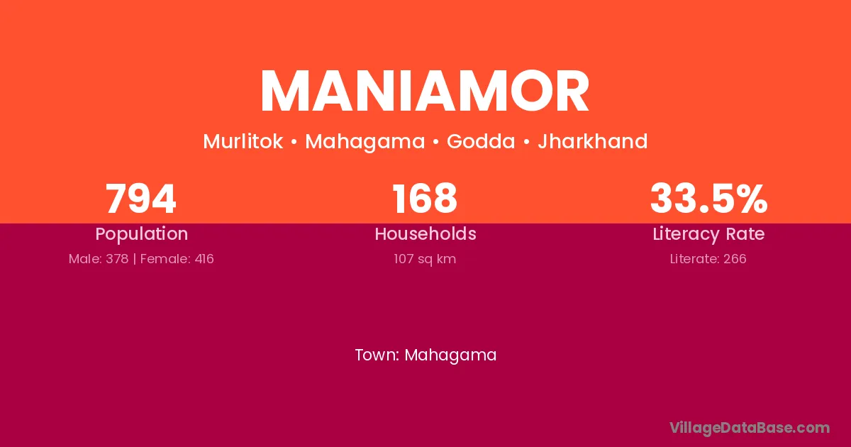 Maniamor village has a total population of 794 people, of which 378 are males and 416 are females.