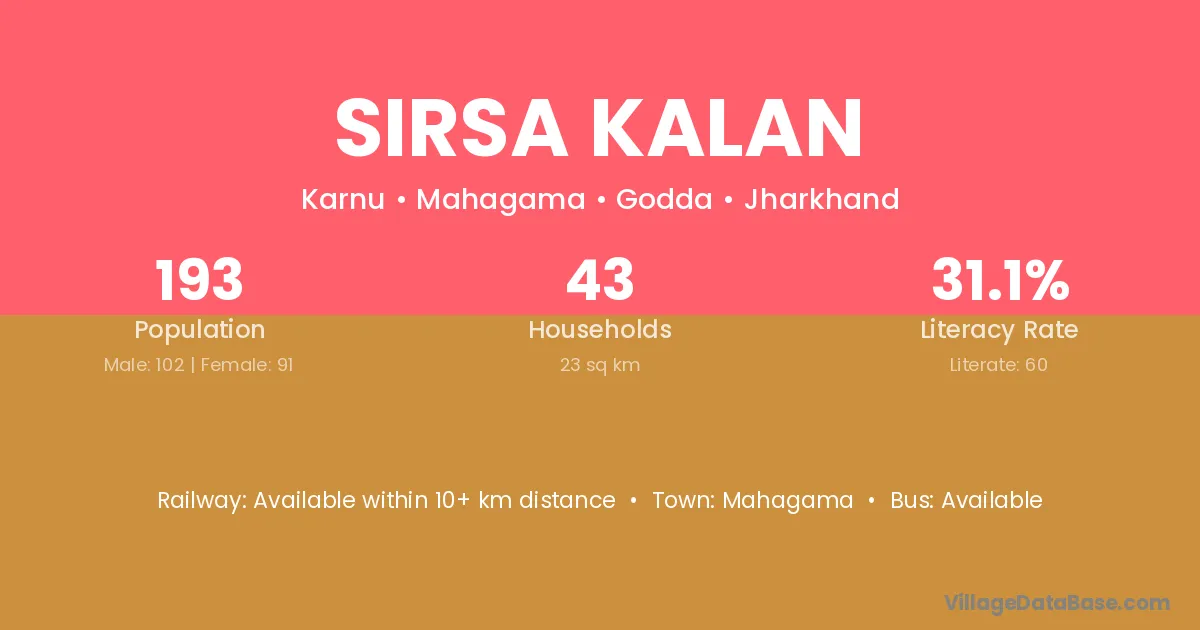 Sirsa Kalan village has a total population of 193 people, of which 102 are males and 91 are females.