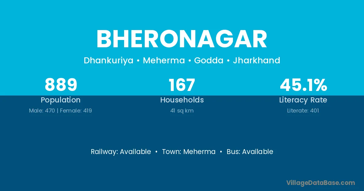 Bheronagar village has a total population of 889 people, of which 470 are males and 419 are females.