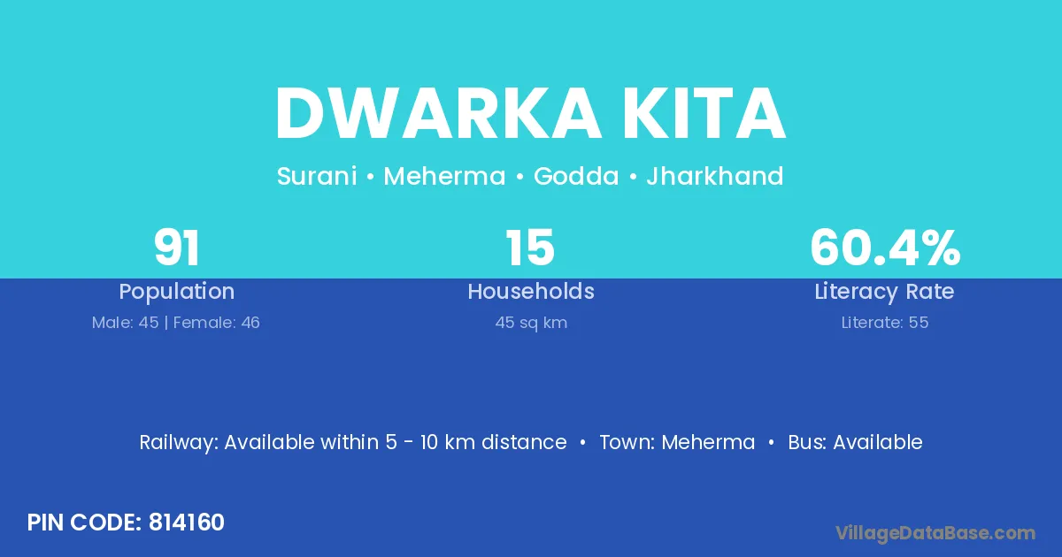 Dwarka Kita village has a total population of 91 people, of which 45 are males and 46 are females.