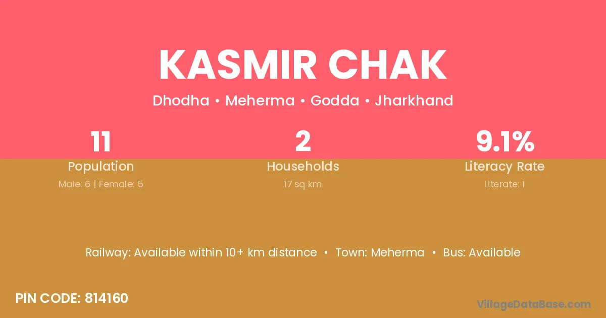 Kasmir Chak village has a total population of 11 people, of which 6 are males and 5 are females.