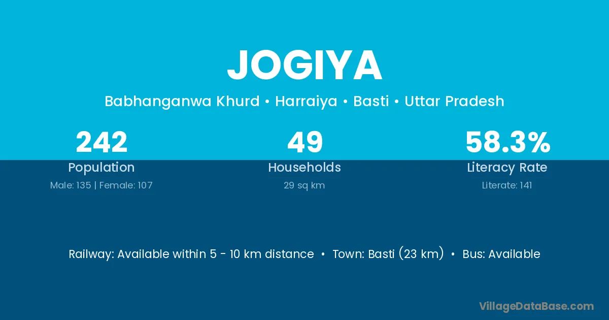 The literacy rate of Jogiya village is 38.32%. Male literacy stands at 46.59% and female literacy at 28.28%.