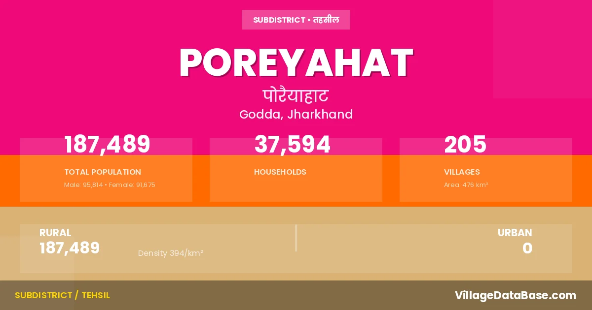 According to the 2011 census The total area of Poreyahat Subdivision is 476 km², with a population of 187489 people. The population density is 394 inhabitants per square kilometre, and there are approximately 37594 houses in the sub district.