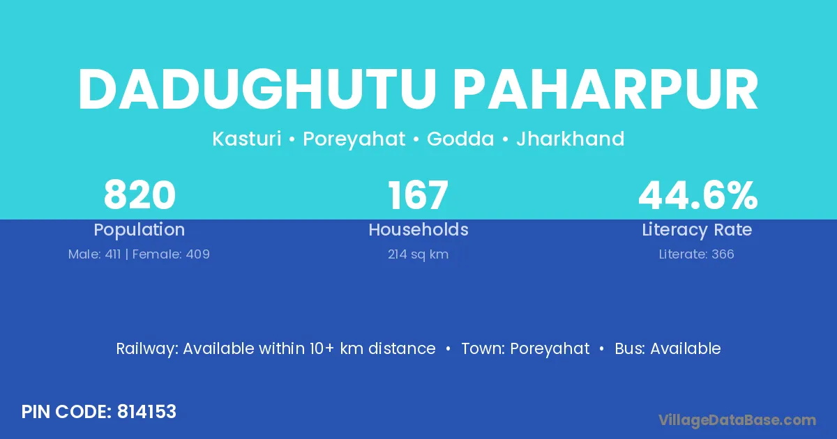 Dadughutu Paharpur village has a total population of 820 people, of which 411 are males and 409 are females.