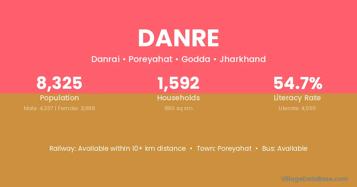 Danre village has a total population of 8,325 people, of which 4,337 are males and 3,988 are females.