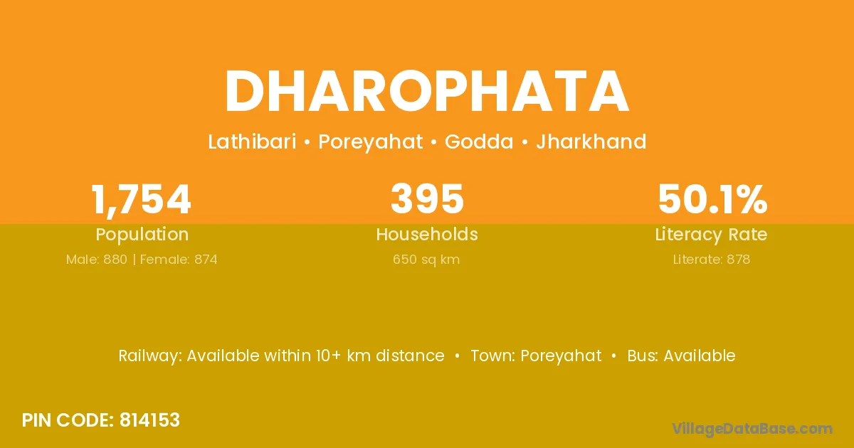 Dharophata village has a total population of 1,754 people, of which 880 are males and 874 are females.