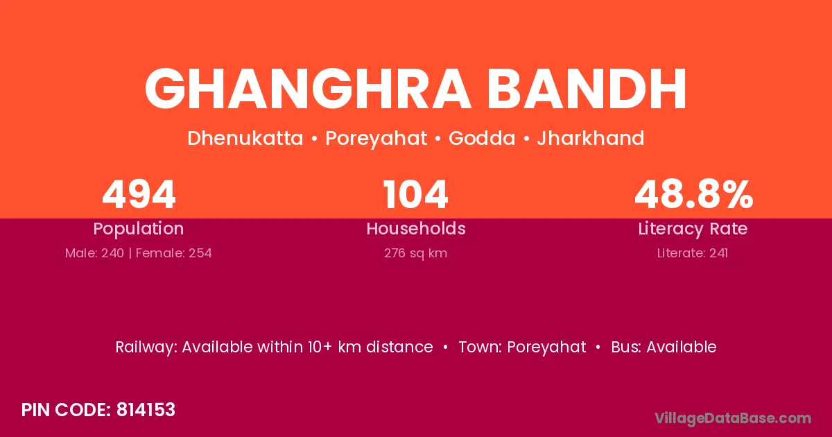 Ghanghra Bandh village has a total population of 494 people, of which 240 are males and 254 are females.