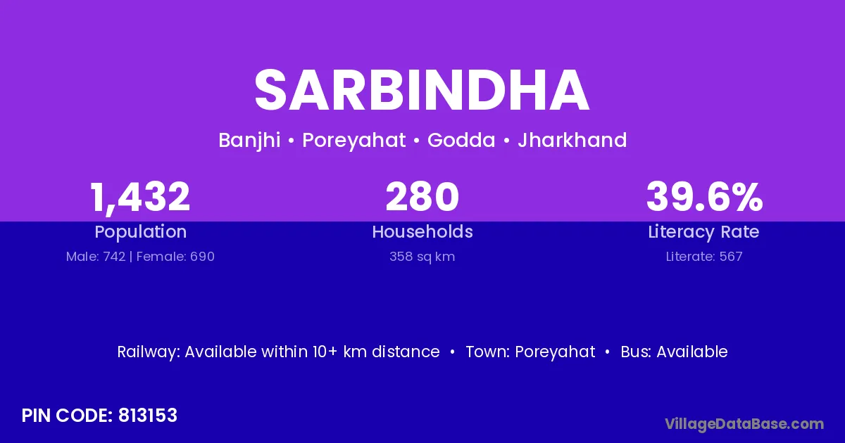 Sarbindha village has a total population of 1,432 people, of which 742 are males and 690 are females.