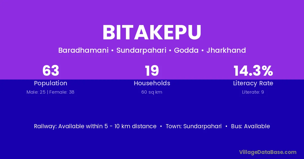 Bitakepu village has a total population of 63 people, of which 25 are males and 38 are females.